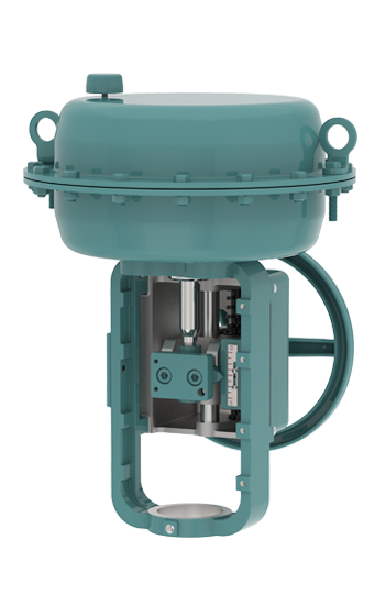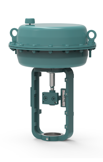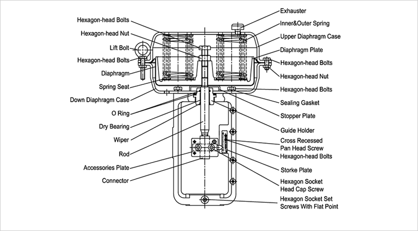 該系列采用多彈簧結(jié)構(gòu),是體積小、重量輕、性能高、輸出力大的氣動(dòng)薄膜式執(zhí)行機(jī)構(gòu)。其工作原理為:由調(diào)節(jié)器來的電或氣信號(hào)經(jīng)定位器轉(zhuǎn)換成的氣壓輸入到膜室里,作用于膜片上產(chǎn)生推力,使推桿移動(dòng),同時(shí)壓縮彈簧直到和彈簧的反作用力平衡,使推桿到達(dá)預(yù)定的位置。